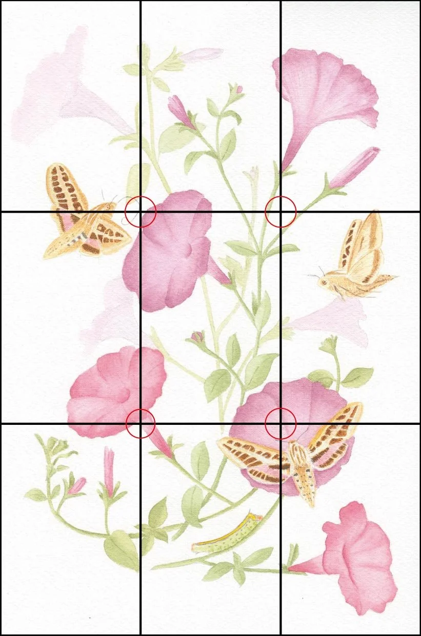 In my painting of the white sphinx moth with petunias, I placed the flowers and moths at the top left and bottom right intersection points.